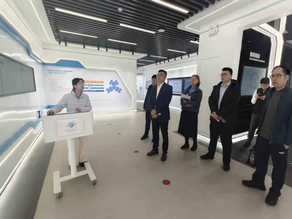 在华中师范大学,徐可明一行与华中师范大学党委常委、副校长李鸿飞以及相关部门负责人开展座谈,双方信息化部门的负责人围绕地方高校在数据治理和信息化建设等领域面临的共性问题展开深入探讨。会前,调研组一行参观了华中师范大学校史馆、教育大数据应用技术国家工程研究中心、智慧教室,详细了解了智慧教室的信息化教学模式、教育大数据中心的典型应用案例,特别是华师在学习行为分析、教学质量评价、学生发展画像等方面的创新实践,为我校后续智慧教育环境建设和教育大数据应用提供了有益参考。