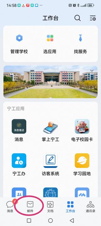 2、手机端:登录企业微信APP,页面下方画圈位置查收邮件。