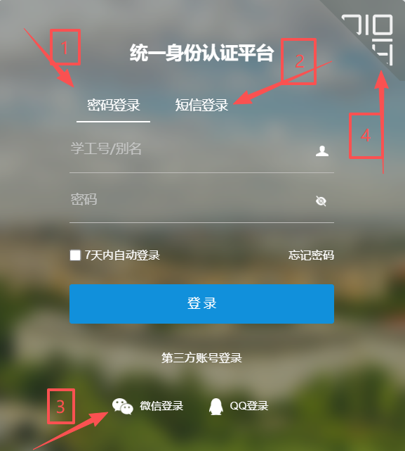 在数字宁工登录页面选择“扫码登录”( 图 1 中箭头3所示的白色标签或者箭头4所示的二维码标签)。
