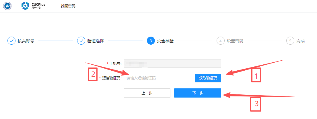 在安全校验页面,点击“获取验证码”按钮,系统会向您绑定的手机号发送一条包含验证码的短信,在指定位置输入收到的验证码,并点击“下一步”。