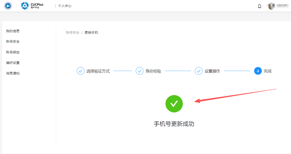 页面提示“手机号更新成功后”后,您的手机号修改流程即全部完成。今后进行手机短信登录或密码找回时,将使用此新号码。
