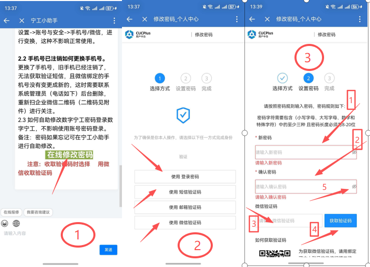 这种方式要求用户现在所使用的手机号为学籍填报时或者教职工入职时所填写的手机号。更换手机号请详见 2 数字宁工修改/绑定手机号操作指南 。