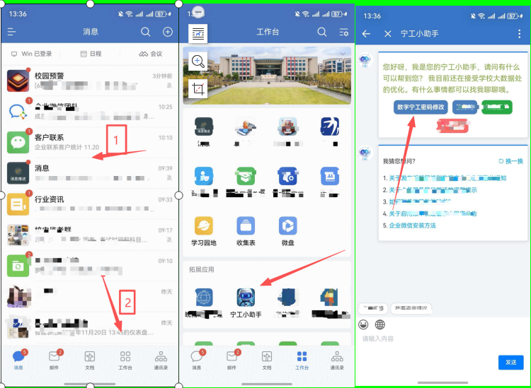 打开企业微信App,点击底部的 “工作台”,找到并点击 “宁工小助手”应用。如 图 15 前两个小图所示。