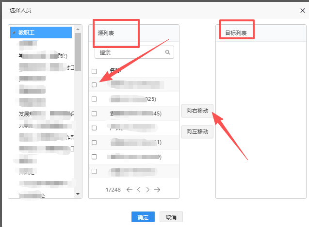 确认添加:在此页面中( 图 36 )您可以按照先展开组织架构列表,当您选择最小一层组织架构时,该组织下的成员会出现在源列表中,在源列表中选中目标成员后,点击“向右移动”按钮,选中的人员将显示在目标列表中。此步骤可添加多个人员,目标列表中为选中人员。然后点击“确定”按钮,这些成员就会被添加到您的分组中。您也可以重复此操作,直到所有必要的成员都添加完毕。