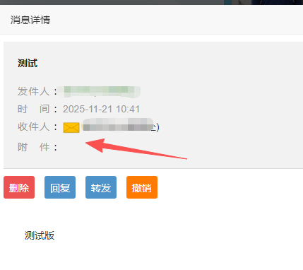 发送给他人的邮件:自己打开此邮件后,如果收件人后的邮件标识为黄色未开启的小信封,说明此邮件收件人未打开,为灰色开启的小信封则说明收件人已经阅读此邮件;(如 图 29 所示,在邮件详情页面,箭头所示的为标识为黄色未开启小信封)。