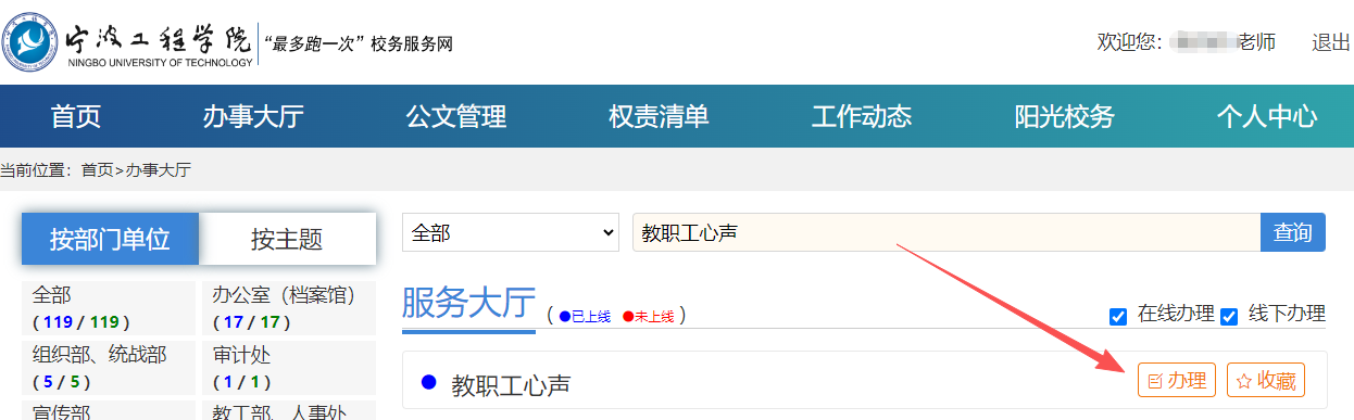 当“教职工心声”出现在搜索结果中后,点击其旁边的“办理”按钮,即可启动该项服务的申请流程。