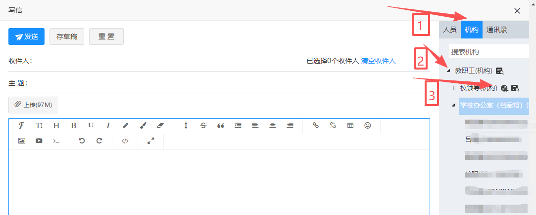 第二步 选择目标机构:当需要向整个部门(如“计算机学院”或“人事处”)发送邮件时,请勿点击部门名称本身,而应点击部门名称右侧的级联选择标志( 图 28 箭头3)。点击后,该机构下的所有成员将自动被添加为邮件收件人。
