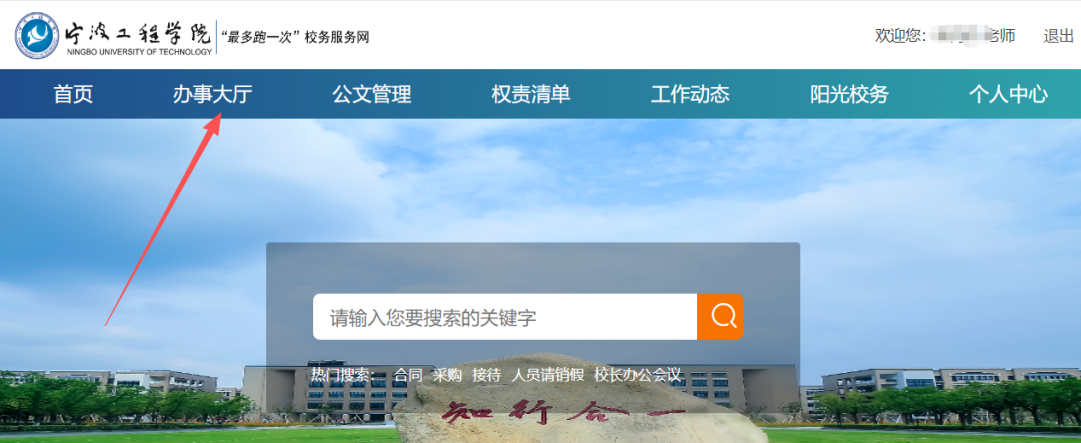 ②在校务服务网的主页,找到并点击标题栏中的“办事大厅”。