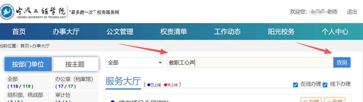 ③在办事大厅的搜索框里直接搜索“教职工心声”。