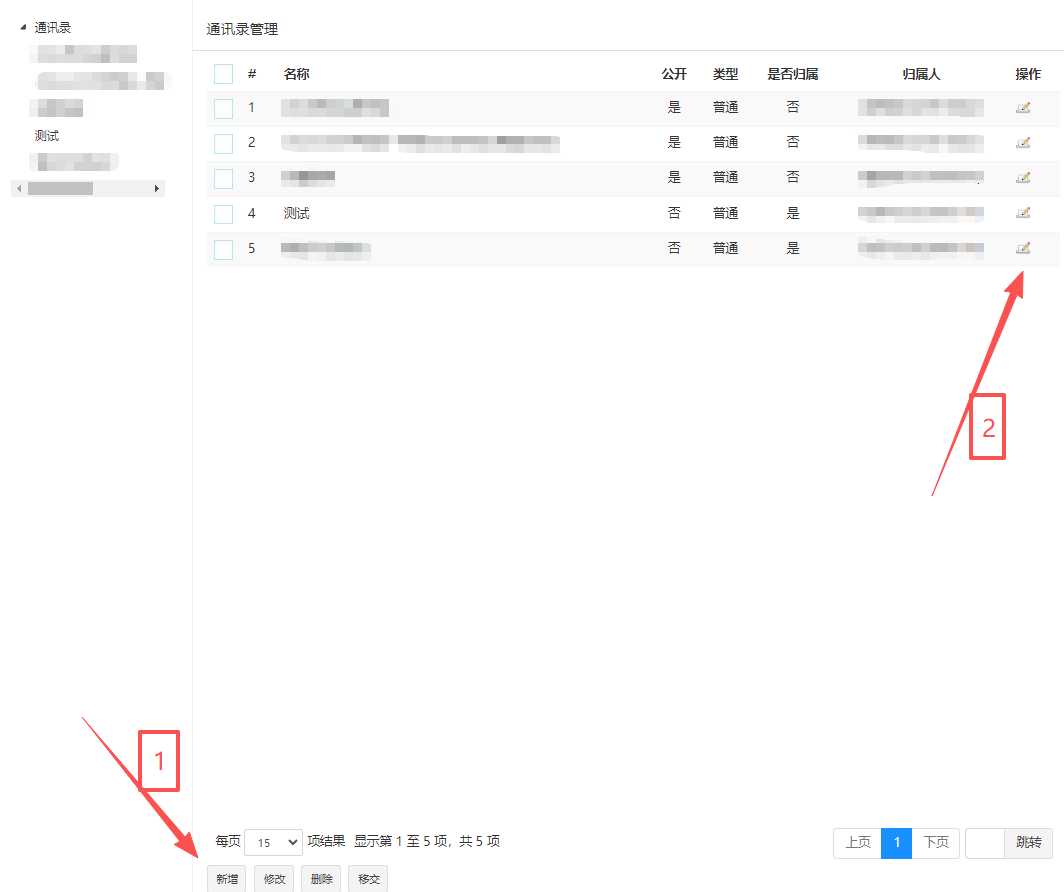 管理成员:在通讯录列表中找到您刚刚创建的分组,点击其对应的“管理成员”按钮( 图 32 箭头2所示的图标)。