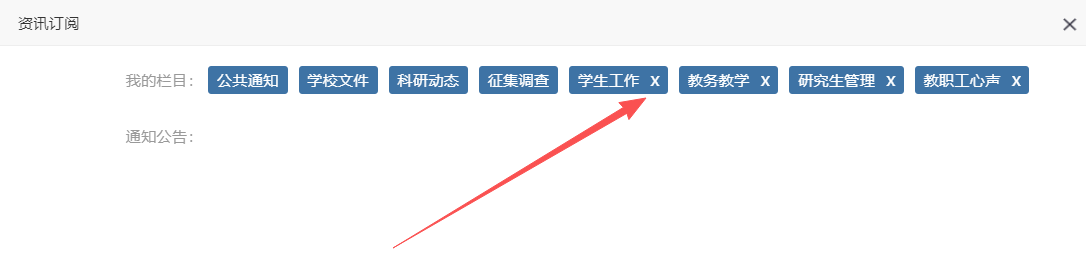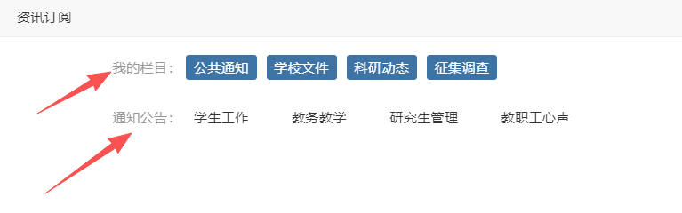 如 图 25 所示,“我的栏目”区域下均为系统默认的固定栏目,不可编辑且会始终显示在主页;而“通知公告”区域下的栏目则为可订阅栏目,用户可自行管理。