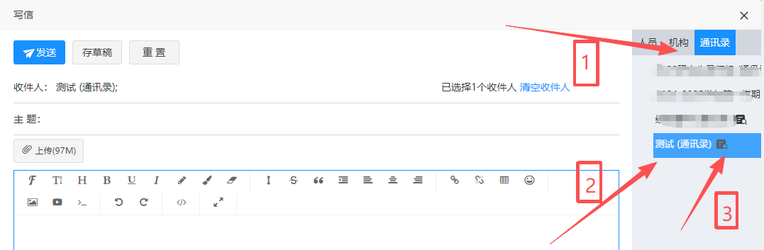 具体操作如 图 27 所示,在数字宁工站内邮件的写信界面,如需向已建立的联系人分组群发邮件,请按以下步骤操作: