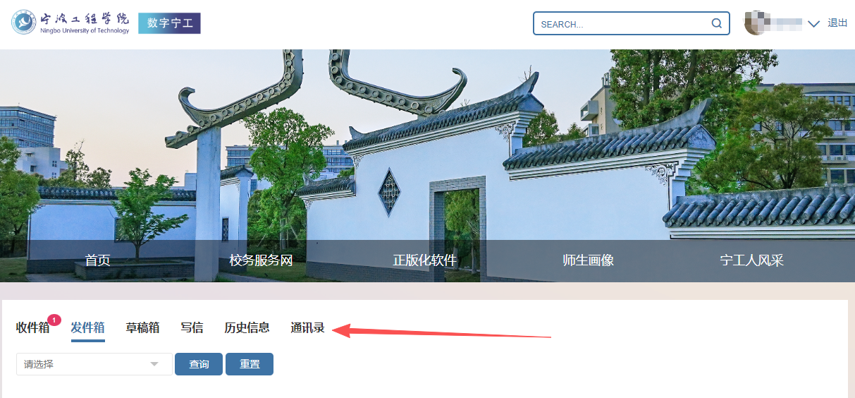 1)进入通讯录管理:登录数字宁工主页,进入“站内邮件”板块,点击“更多”后选择“通讯录”功能。